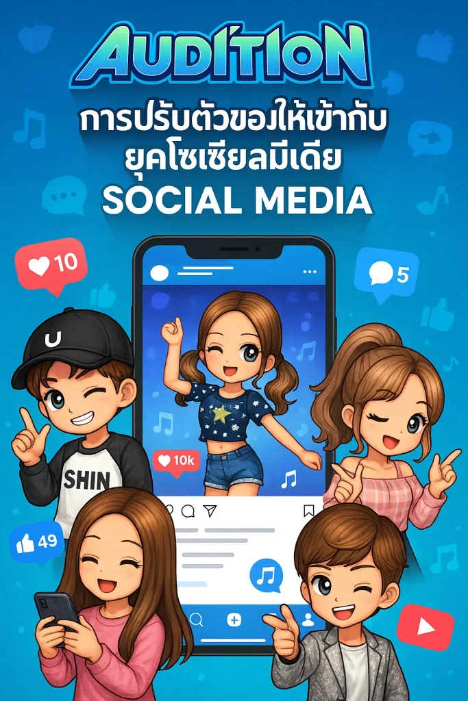 AUDITION ให้เข้ากับยุคโซเชียลมีเดีย จากร้านเกมที่เคยคึกคัก สู่มือถือที่ทุกคนพกติดตัว และจากบอร์ดเกมสู่ Facebook, TikTok, YouTube AUDITION แสดงให้เห็นถึงการปรับตัวที่ชาญฉลาด เกมไม่ได้หยุดอยู่แค่ความสนุกในห้องแชท แต่ก้าวเข้าสู่ การเป็นส่วนหนึ่งของวัฒนธรรมโซเชียลมีเดีย อย่างเต็มรูปแบบ
